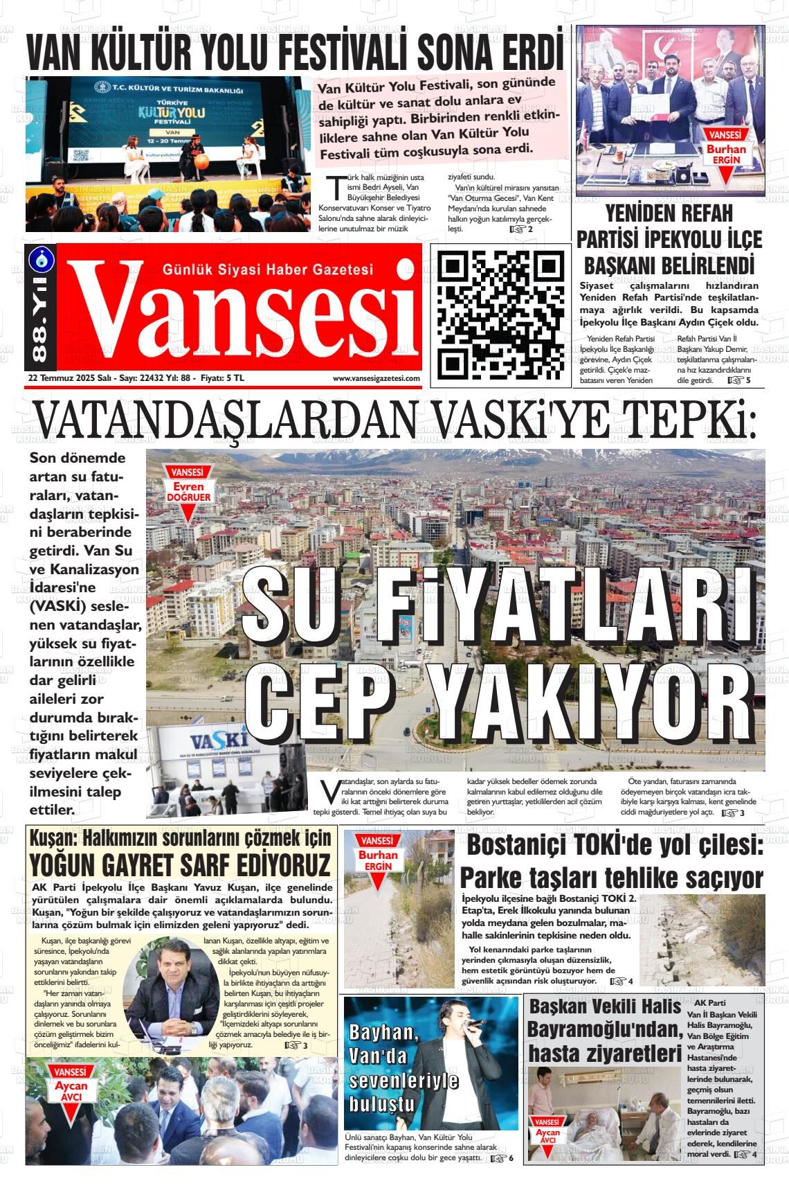Başkale Gazetesi’nin 22 Temmuz Salı 2025 tarihli manşeti;