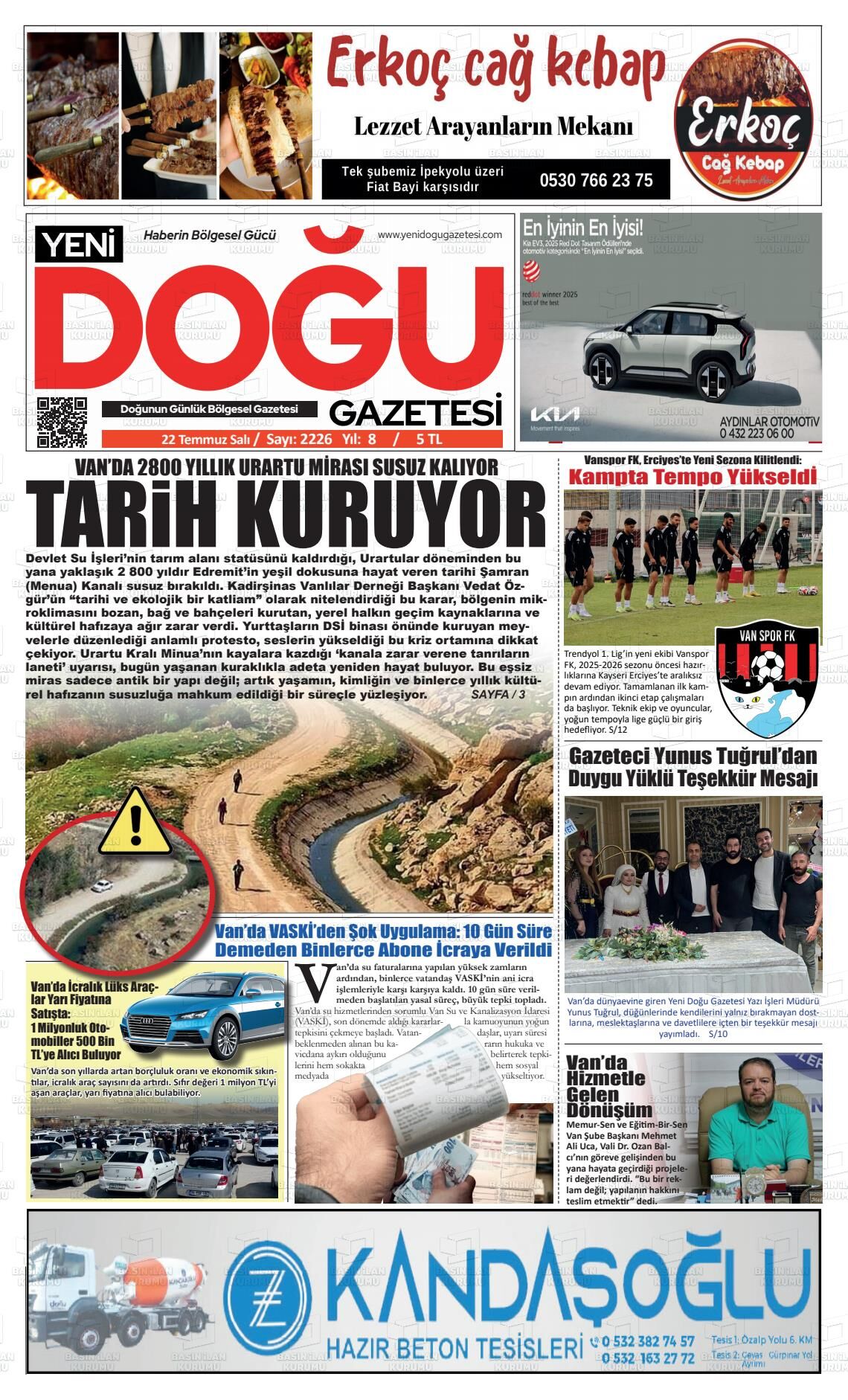 Erciş Gazetesi’nin 22 Temmuz Salı 2025 tarihli manşeti;