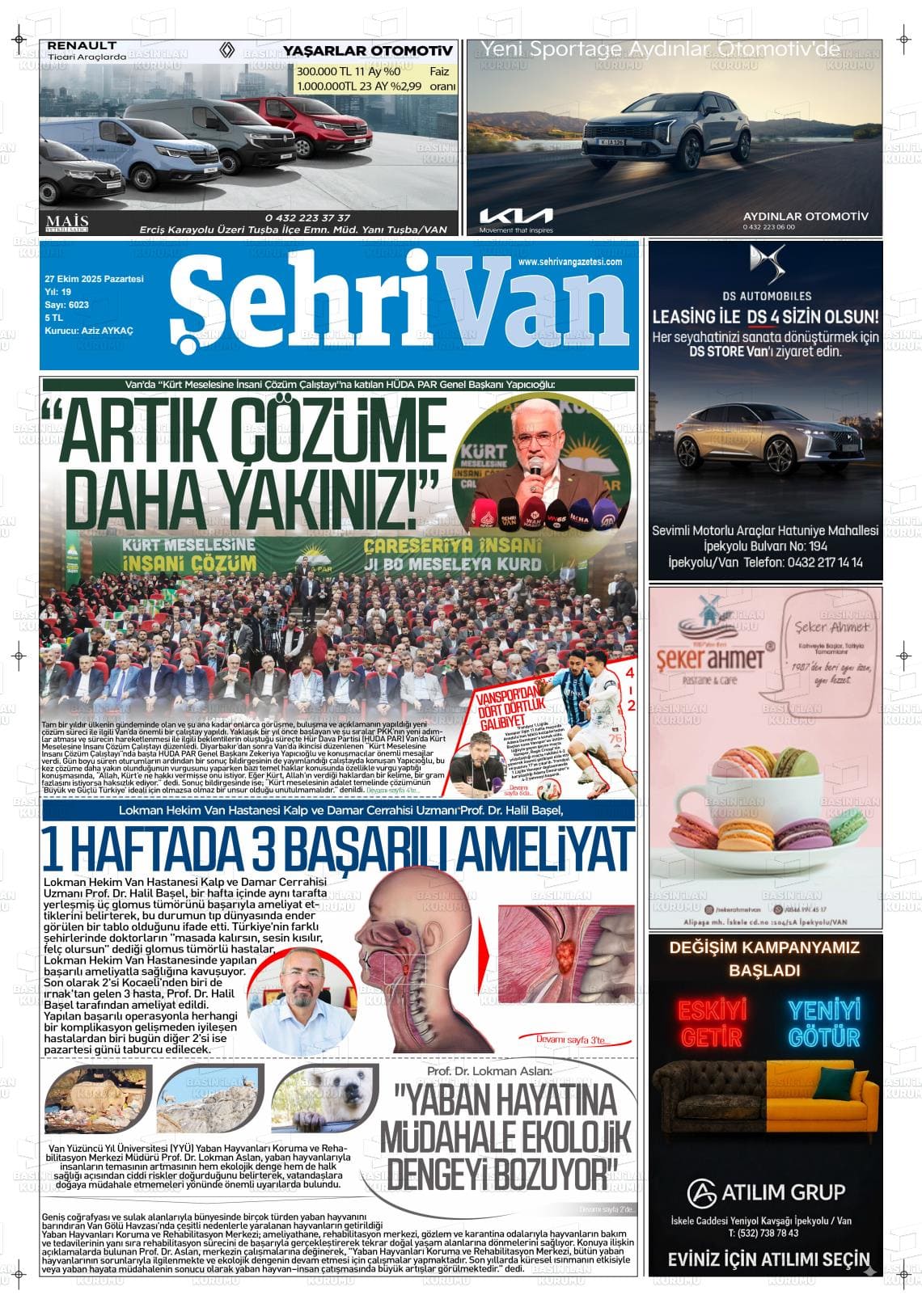 Şehrivan Gazetesi’nin 27 Ekim Pazartesi 2025 tarihli manşeti;