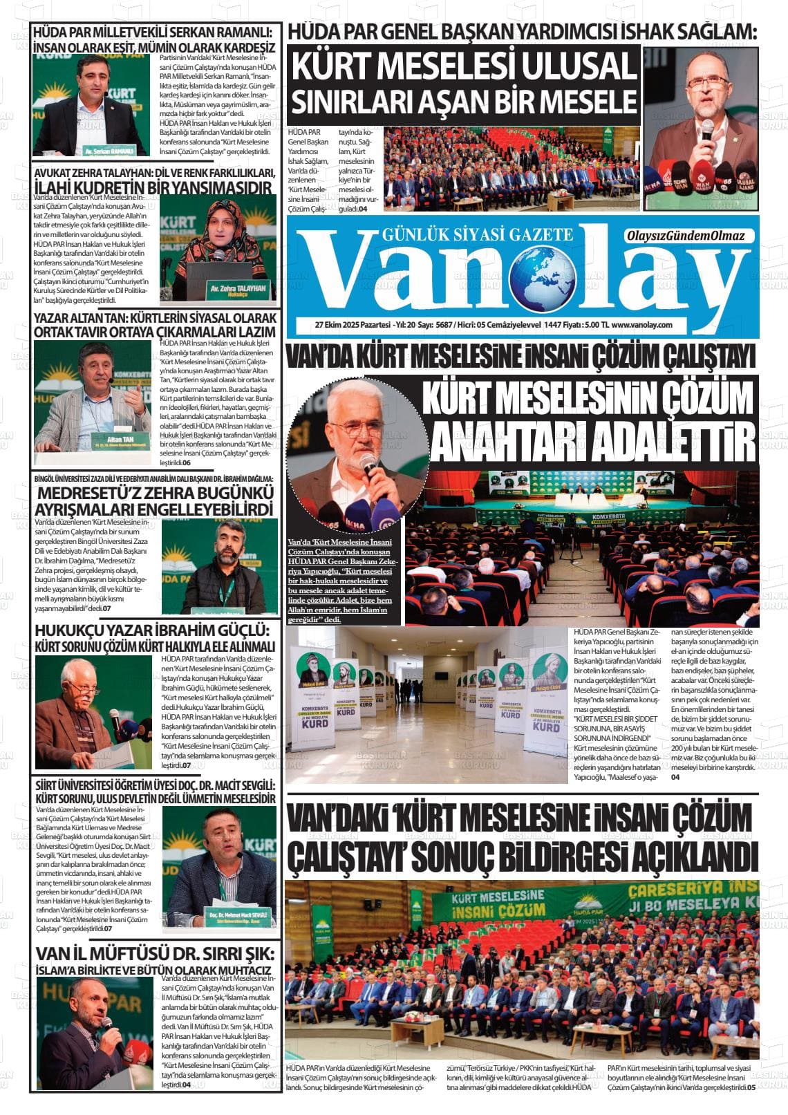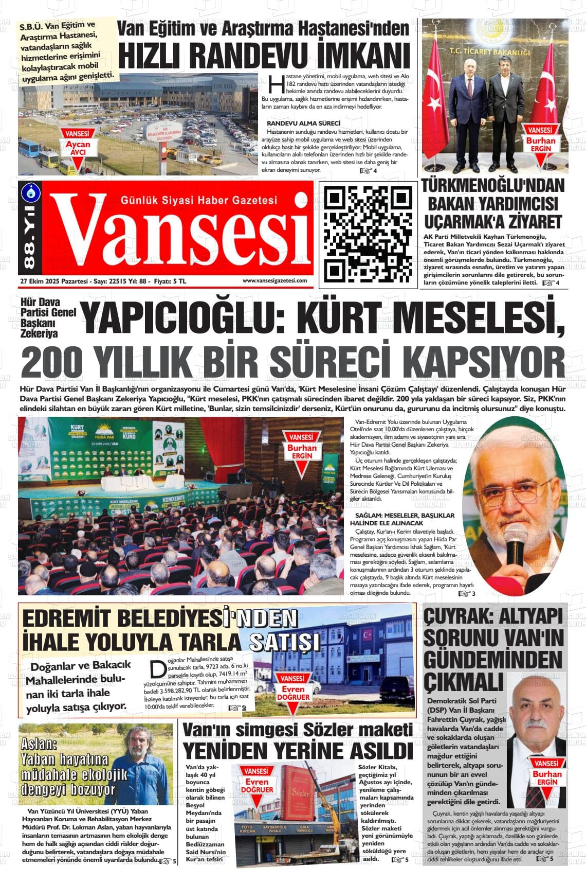 Vansesi Gazetesi’nin 27 Ekim Pazartesi 2025 tarihli manşeti;