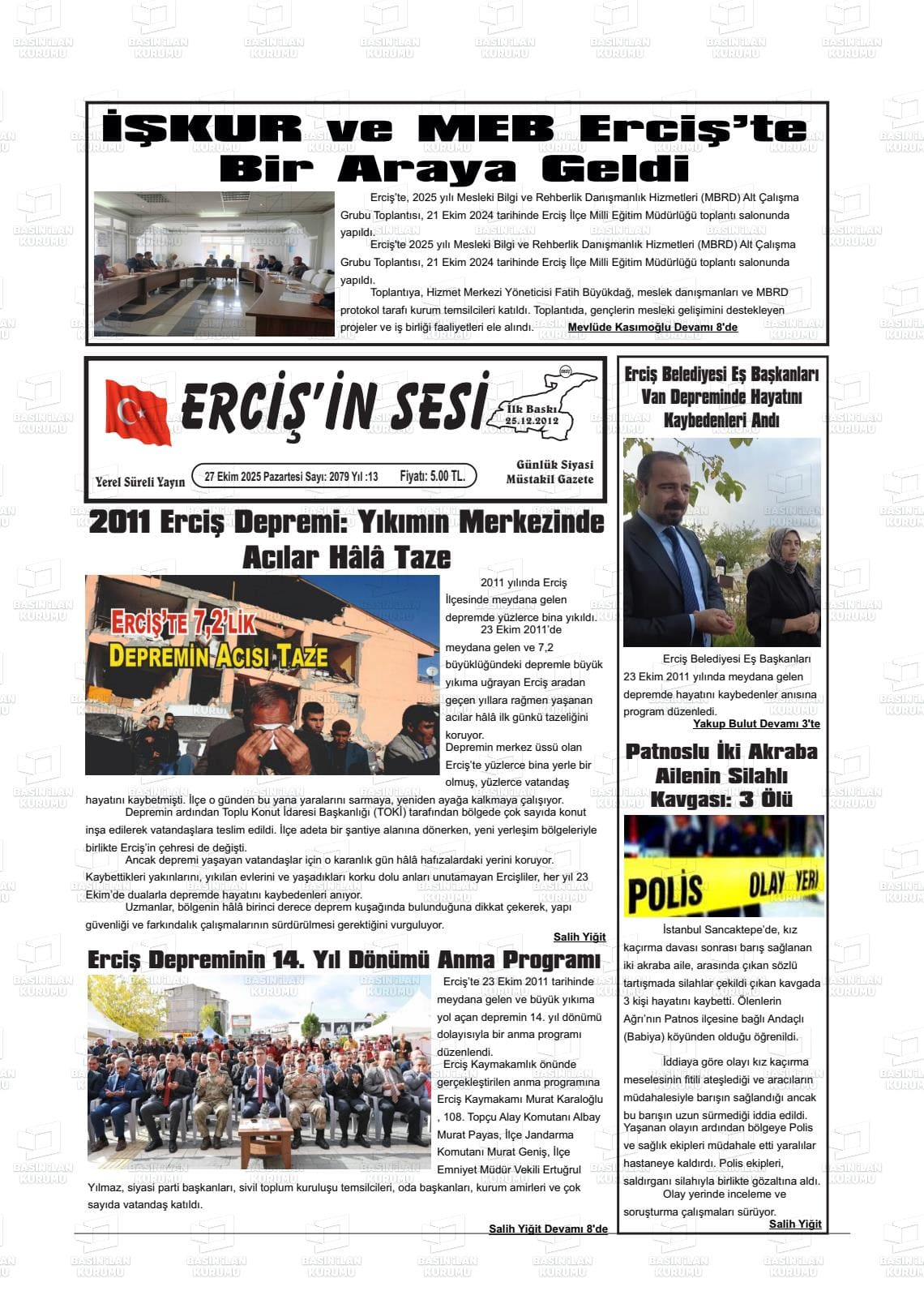 Erciş Sesi Gazetesi’nin 27 Ekim Pazartesi 2025 tarihli manşeti;