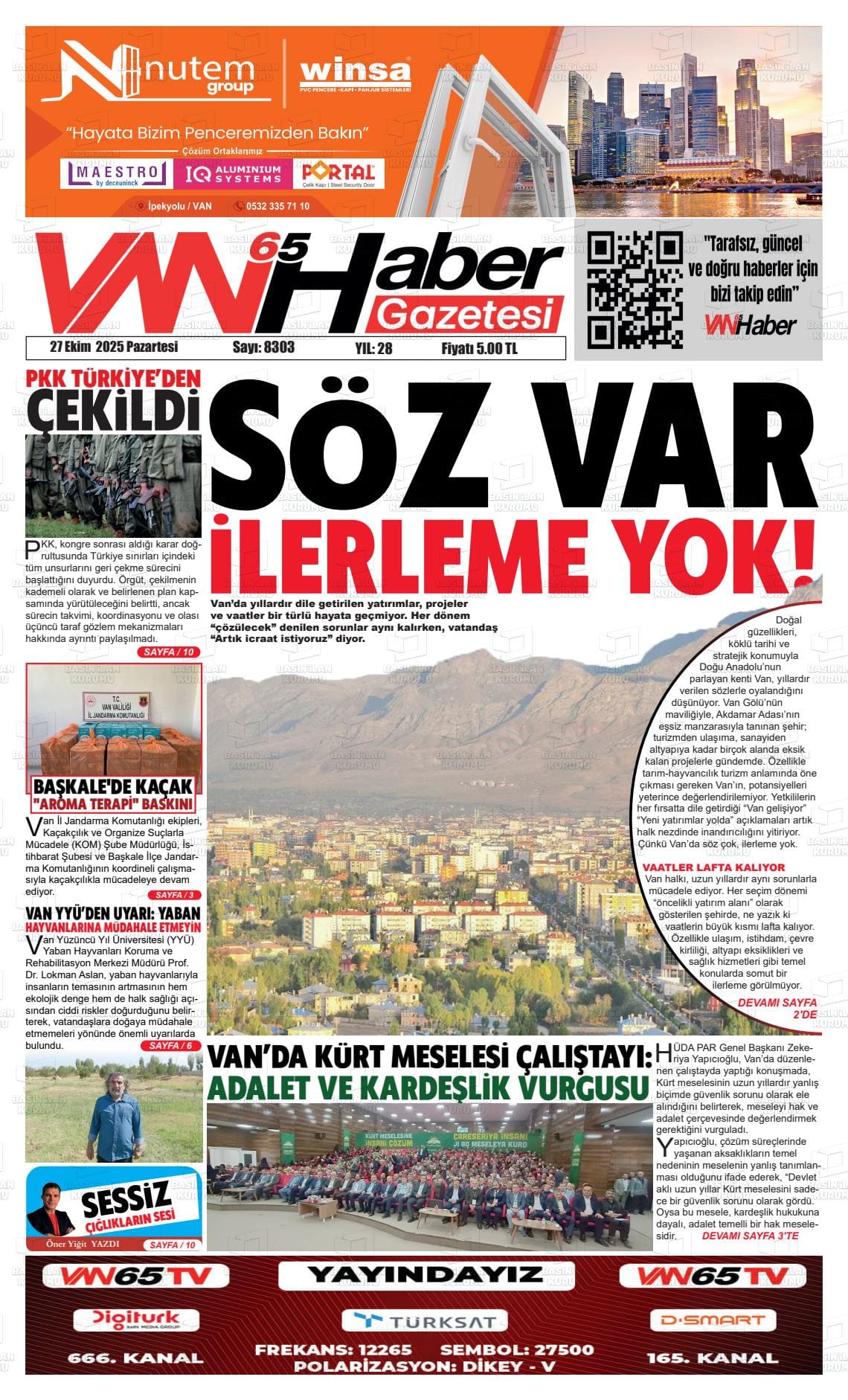 Van65 Haber Gazetesi’nin27 Ekim Pazartesi 2025 tarihli manşeti;
