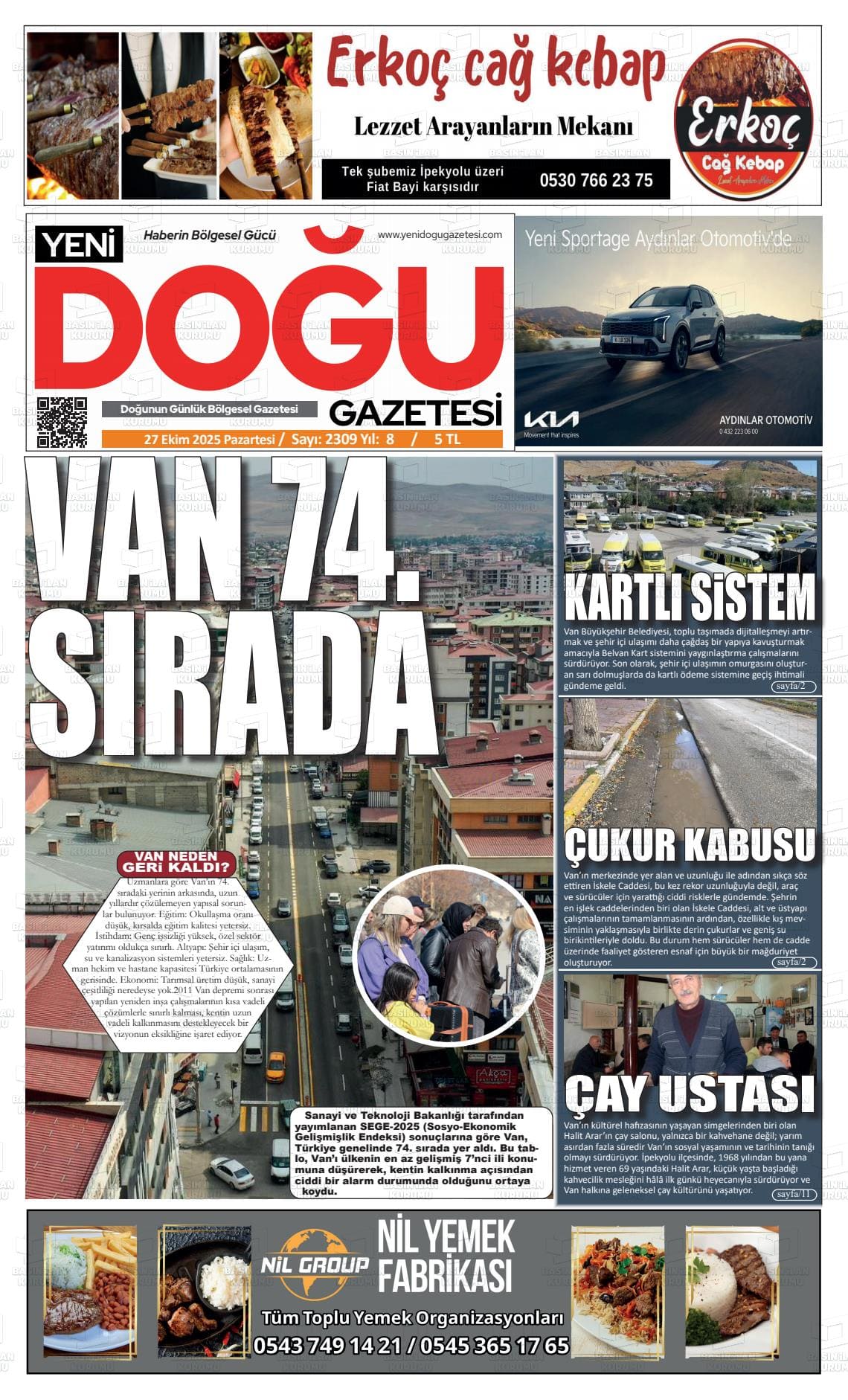 Yeni Doğu Gazetesi’nin 27 Ekim Pazartesi 2025 tarihli manşeti;