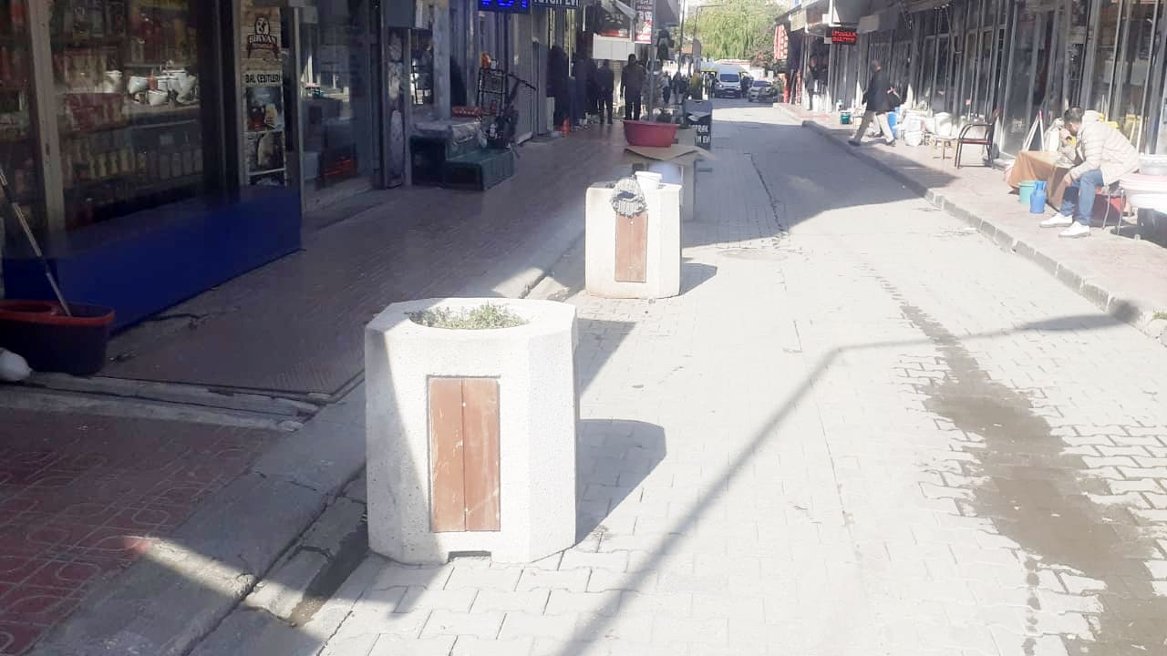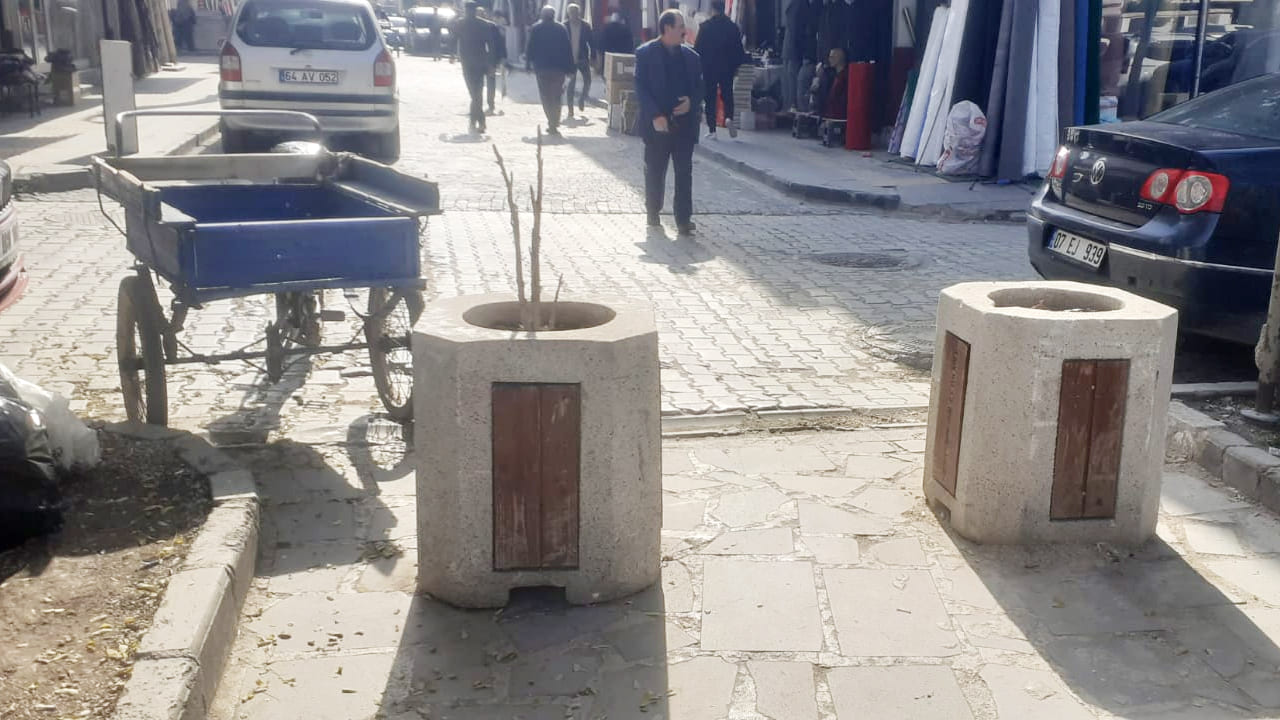 Saksıların, bazı noktalarda araçların kaldırıma park etmesini önlemek amacıyla 3-4 metre aralıklarla yerleştirildiği görülürken, beleyenin hem yeşillendirme amacı boşa çıktı hem de saksılar kentin görüntüsünü olumsuz etkileyen beton yığınlarına dönüştü.