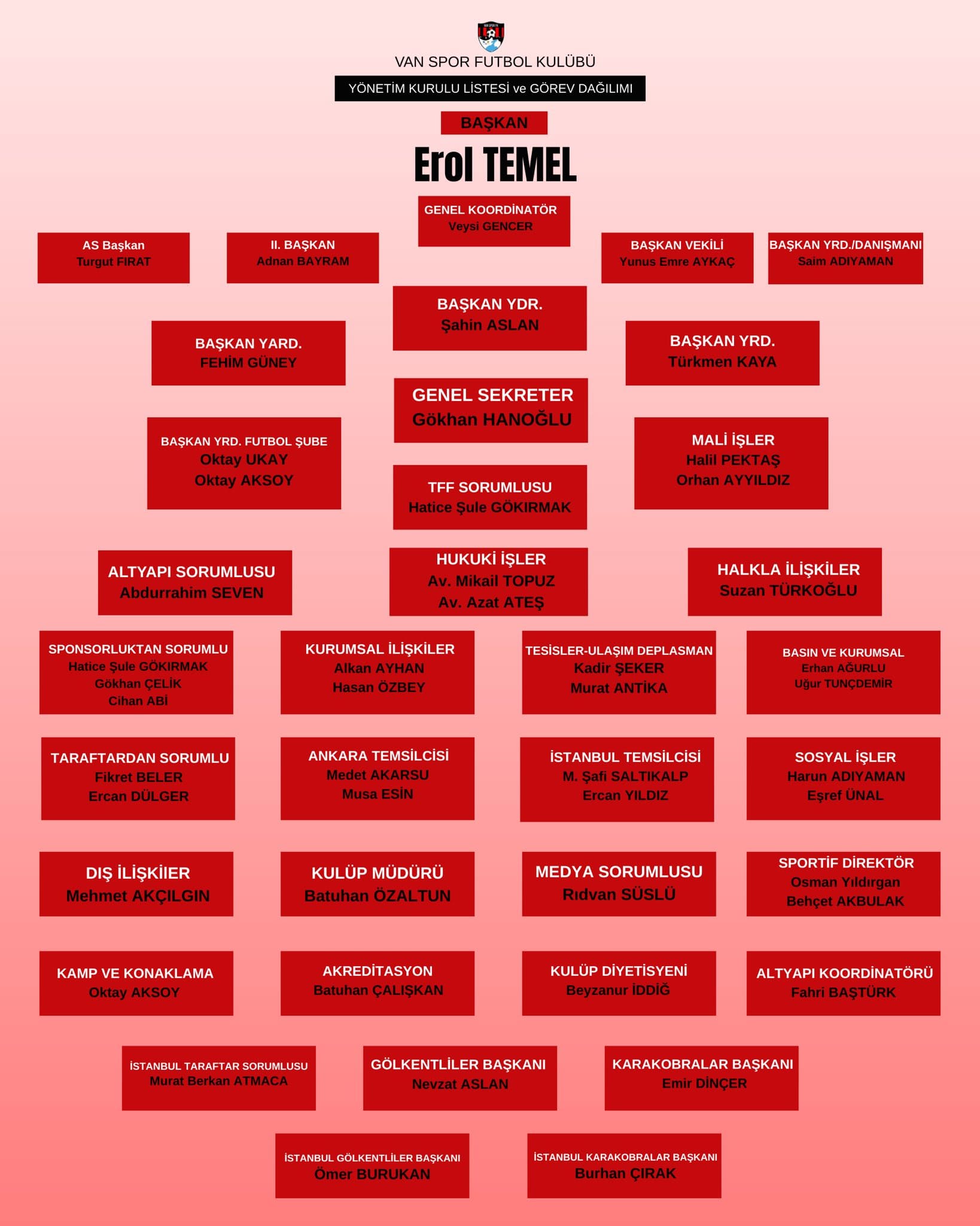 Kulübün resmi olarak açıkladığı listeyle birlikte Vanspor’da yeni bir dönem resmen başladı. Kongre sonrası yapılan görev dağılımına göre kulüp başkanlığı görevine Erol Temel getirildi.